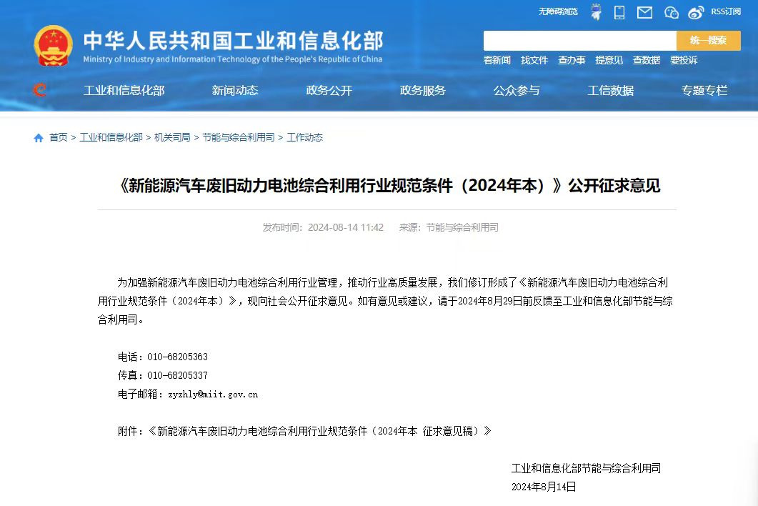工信部发文,规范废旧动力电池综合利用8月14日消息,工业和信息化部节能与综合利用司修订形成了《新能源汽车废旧动力电池综合利用行业规范条件(2
